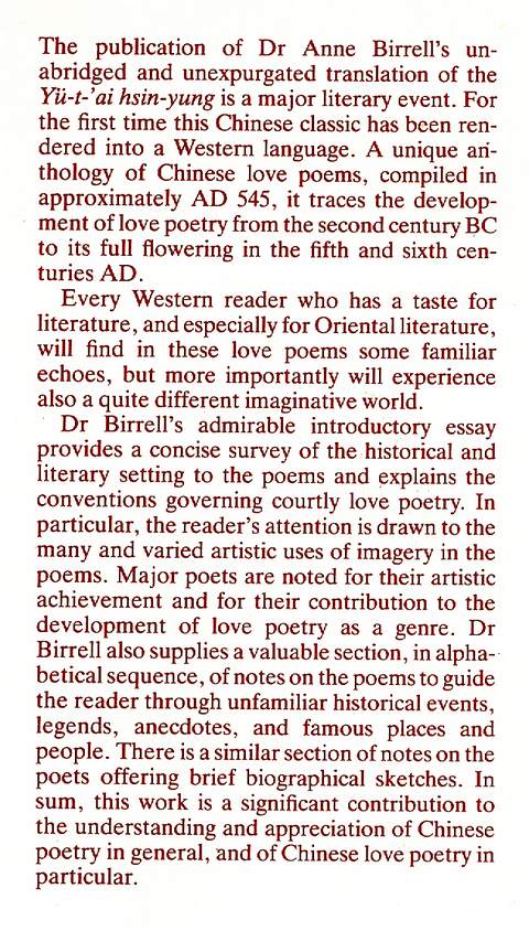 An Anthology of Early Chinese Love Poetry, Translated with Annotations and an Introduction, introduction, notes, chronological table, location map, appendix giving background to poets and poems, index of titles, xxx & 374 pp, maroon boards in d/w, spine of d/w a little sunned, otherwise in almost-new condition, George Allen & Unwin 1982