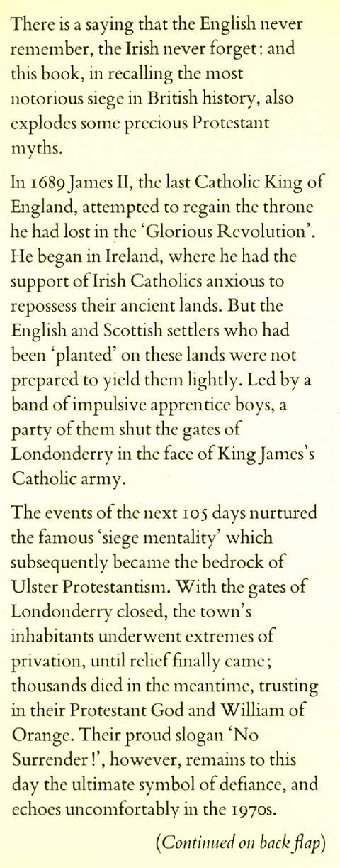 The Siege of Londonderry 1689, b&w illustrations from portraits, paintings, engravings and reproductions of contemporary documents, location maps, index, viii & 218 pp, brown boards in d/w, extremities of d/w a little rubbed, spine of d/w sunned, crease to spine, slight spotting to top closed edge of pages, otherwise in very good condition, Macdonald and Jane’s 1975