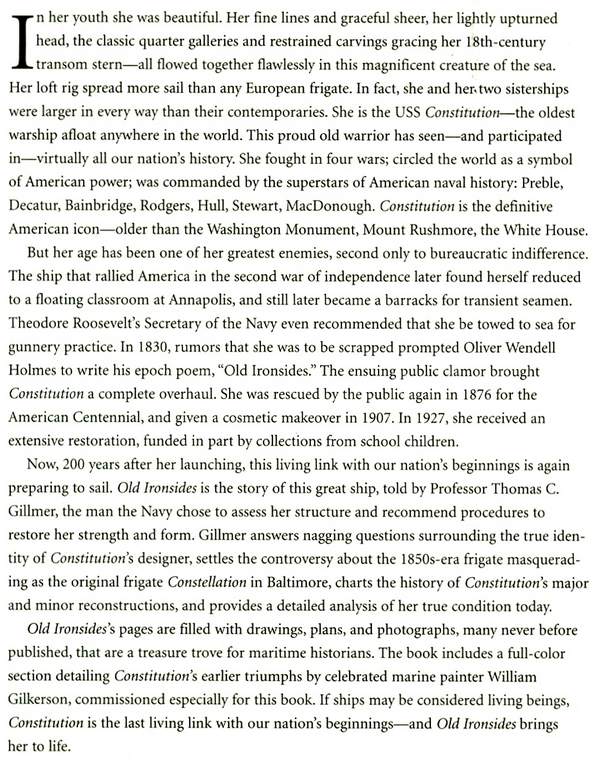 The Rise, Decline and Resurrection of the USS ‘Constitution’, 8 pp coloured plates from paintings by William Gilkerson (see specimen below), very numerous b&w illustrations from photographs and drawings, numerous plans and cross-sections of the ship at various times in its life, notes, bibliography and index, xiv & 239 pp, paperback, inscription on half-title, otherwise in very good condition, International Marine (Camden, Maine) 1997