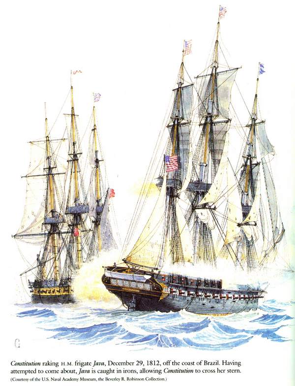While ‘Java’ was sailing south towards the Cape of Good Hope, she was sighted by ‘Constitution’, which gave chase. A fierce fight ensued (see the picture below) lasting some four hours, but ‘Java’ was dismasted and her captain killed (like Nelson) by a sniper’s bullet. On inspection, ‘Java’ was too badly damaged to be worth salvaging, so she was set on fire. She sank when her powder magazine exploded, taking the plans for the new British frigates with her. New copies of the plans had to be sent out on another ship.