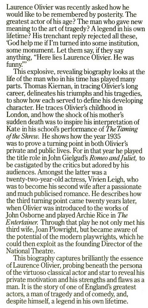 The Life of Laurence Olivier, b&w portrait frontispiece and several b&w photographic illustrations, bibliography, index, x & 302 pp, grey boards with dark red cloth spine in d/w, in very good condition, Sidgwick & Jackson 1981