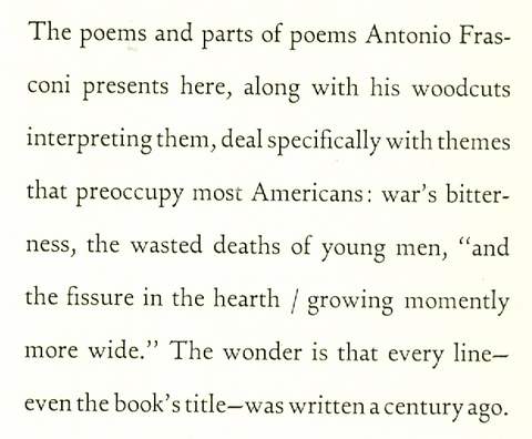 Selections from the Poems of Herman Melville, Edited, and with Woodcuts, by Antonio Frasconi, unpaginated [but in fact 45 pp], black cloth in d/w, top and bottom edges of covers rubbed, d/w a little creased along edges and rear cover, small tear to top edge of d/w, spine and front edge of d/w a little faded, otherwise in very good condition, Farrar, Straus and Giroux (New York) 1972