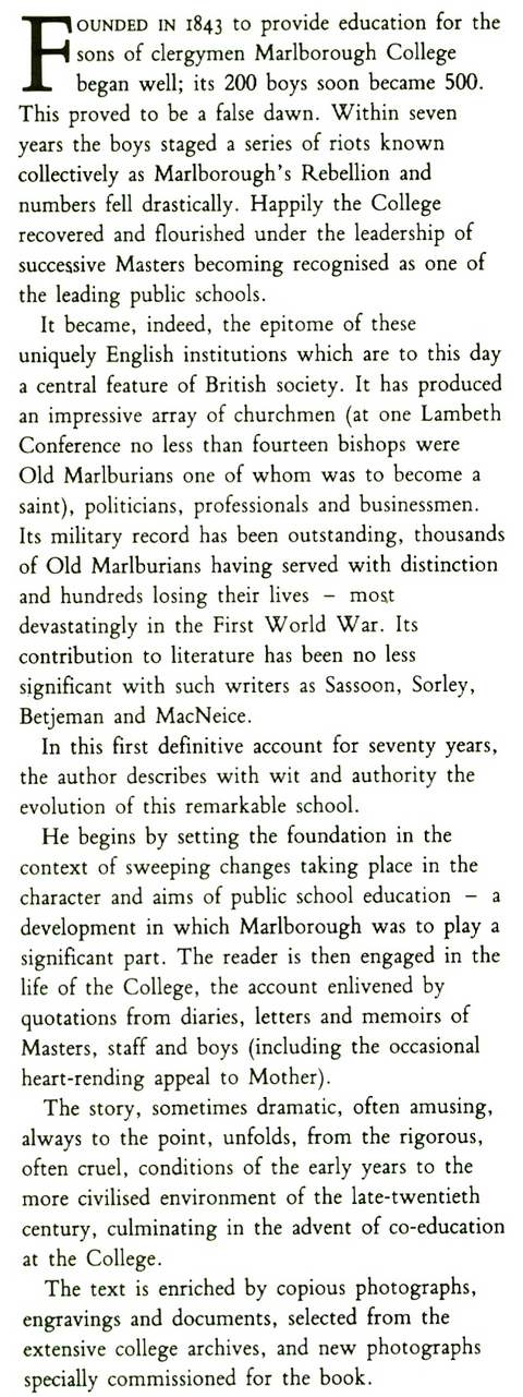 A History of Marlborough College, numerous illustrations (several in colour) from photographs, paintings, sketches, drawings and cartoons, ground-plans, chronology, index, 241 pp, dark blue boards in d/w, top and bottom edges of d/w slightly creased, otherwise in very good condition, James & James 1992
