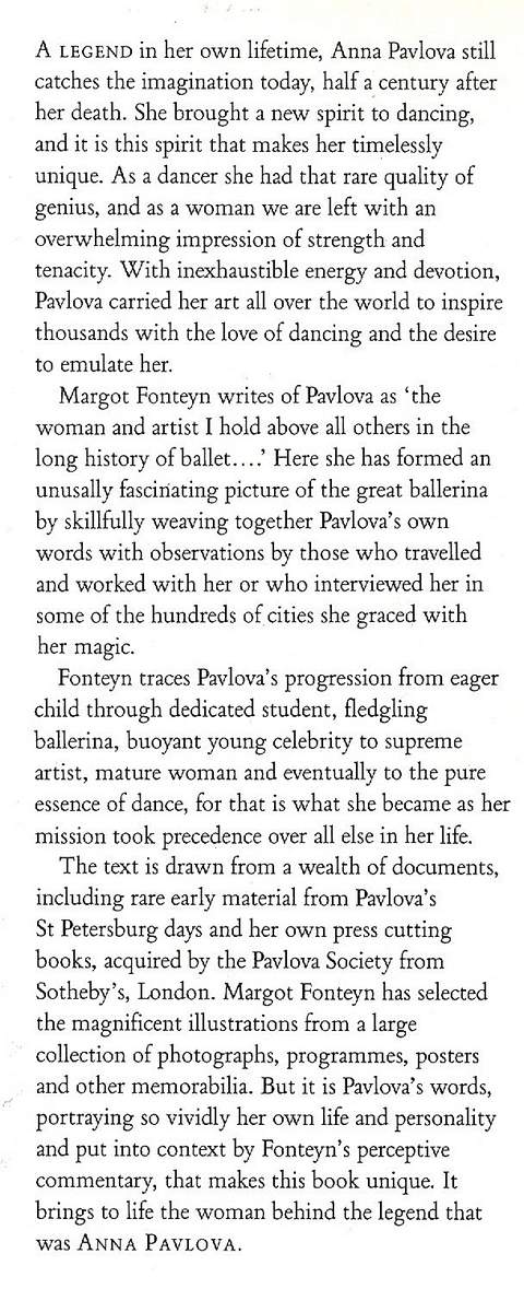 Although we give Margot Fonteyn as the editor, the book appears to have been a collaboration between Margot Fonteyn, who contributes a one-page introduction and who selected the illustrations, and Roberta and John Lazzarini, the curators of the Pavlova Archive and Museum at Ivy House, Pavlova's London home. The book’s text is made up of extracts from documents and press cuttings, some in Pavlova’s own words, followed by a commentary in italics, and it seems likely that the commentaries were provided mainly by the Lazzarinis. See below the description from the dustwrapper flap.