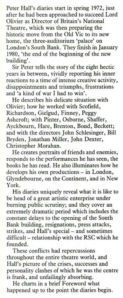 The diaries span the period spring 1972, just after Peter Hall’s appointment as Director of the National Theatre, to January 1980, when the Theatre had become established in its new building.  The diaries “reveal what it is like to be head of a great artistic enterprise under burning public scrutiny”.