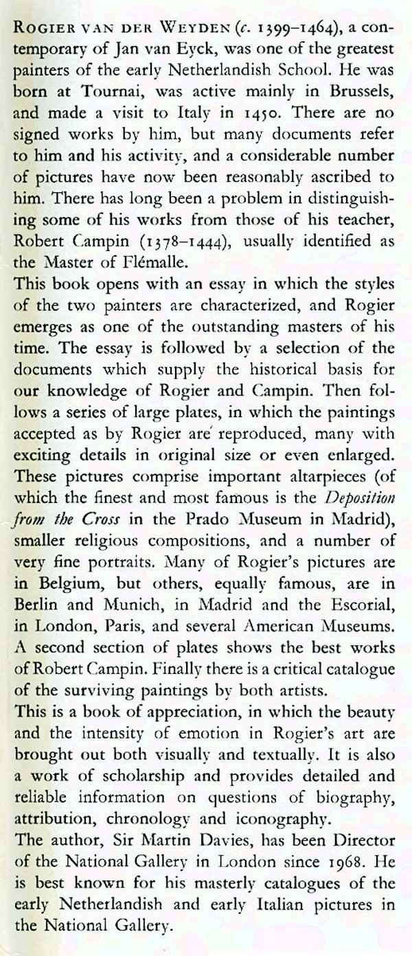 A master of the Early Netherlandish School, and a contemporary of Van Eyck, though he signed none of his paintings, and their attribution to him is difficult at this distance. See the description (below) from the dustwrapper flap.