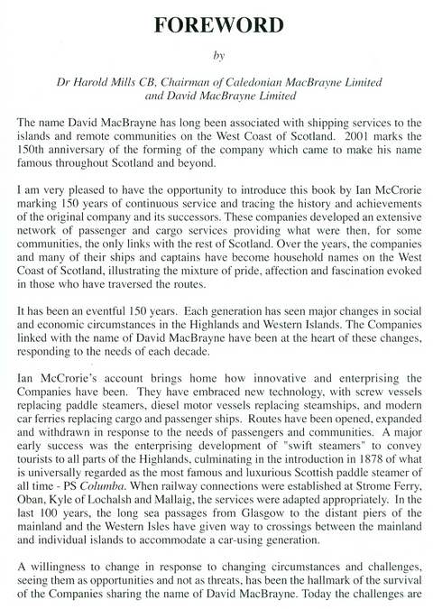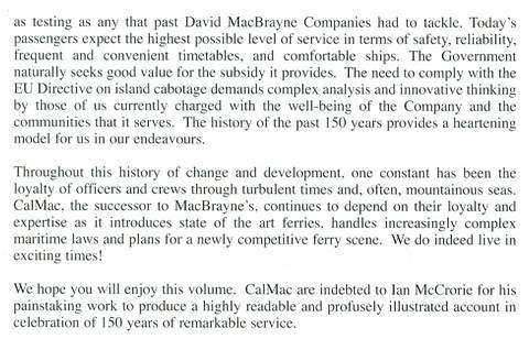 150 Years of MacBrayne Shipping, very numerous photographs in colour and b&w, numerous reproductions of advertisements, maps, 189 pp, sewn paperback, spine creased, top closed edge of pages very slightly marked, otherwise in very good condition, Caledonian MacBrayne (Gourock, Renfrewshire) 2001