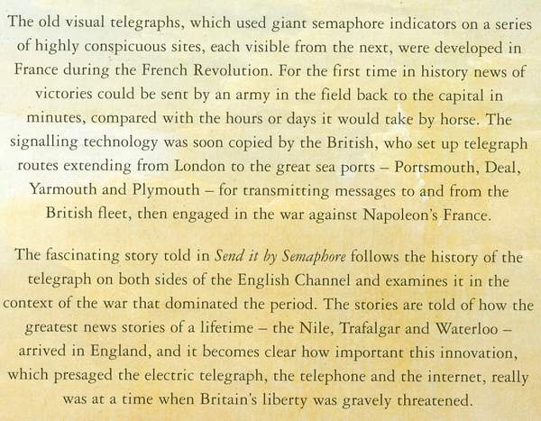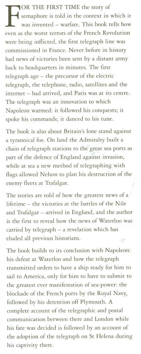 The Old Telegraphs During the Wars with France, b&w illustrations from photographs, paintings, drawings, cartoons, maps and diagrams, notes, chronology, bibliography, index, 240 pp, black boards in d/w, rear top corner of cover a little bumped, otherwise in near fine condition, Crowood Press (Marlborough, Wiltshire) 2005