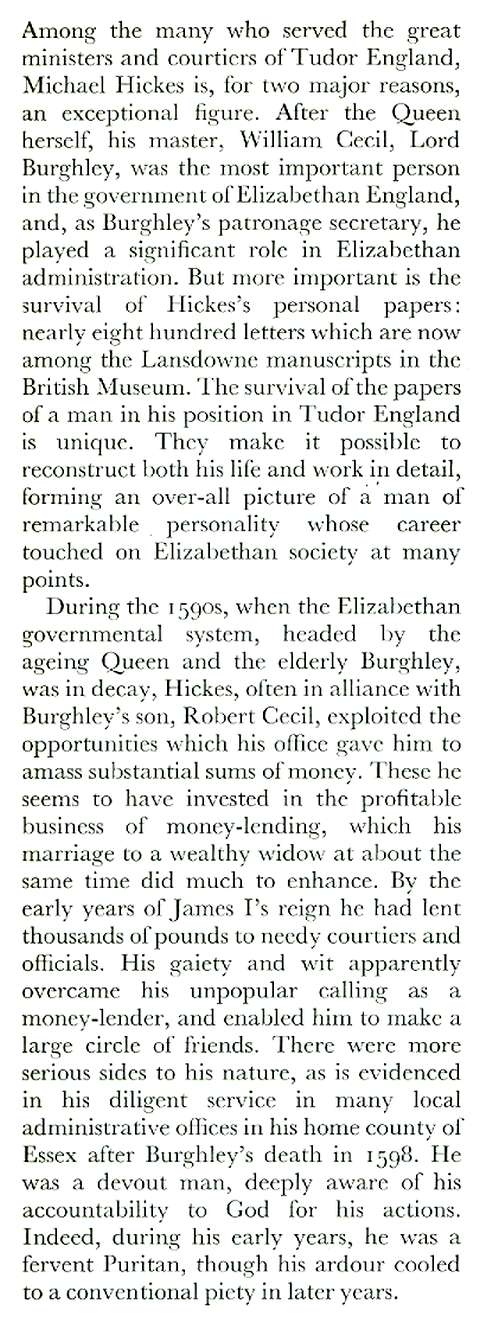 The Life of Sir Michael Hickes, 1543 - 1612, b&w illustrations from portraits, bibliographical notes and index, 221 pp, black cloth in d/w, top corners a trifle bumped, small puncture to d/w on front hinge (see picture) but no damage to covers underneath, neat inscription on front paste-down (covered by d/w flap), otherwise in very good condition, Jonathan Cape 1977