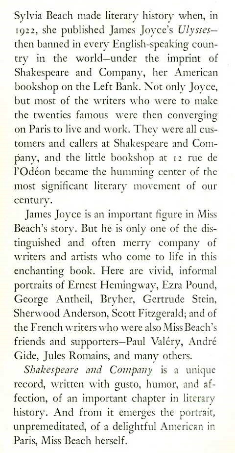 The Story of an American Bookshop in Paris, b&w illustrations from photographs, a few line-drawn illustrations in text, reproduction of page of proof of first edition of ‘Ulysses’, index, xvi & 230 pp, yellow cloth in d/w, d/w a little torn at top and bottom of spine and slightly marked on front cover where a label has been removed, otherwise in very good condition, Harcourt, Brace and Company (New York) 1959