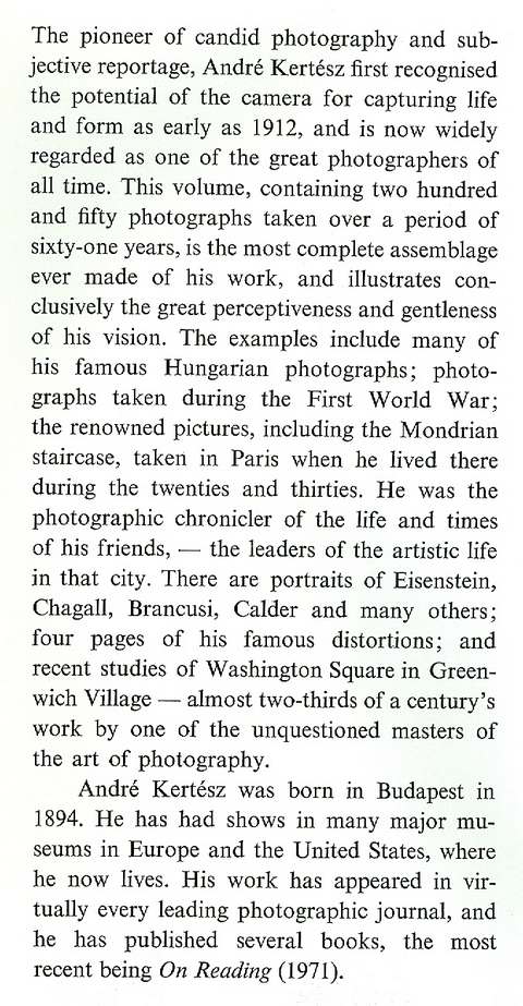 1912-1972, chronology, list of articles about Kertesz and extremely brief notes to the plates, album of b&w plates (see specimen below), 224 pp, grey cloth in d/w, d/w torn and rubbed at top edge (but neatly repaired), contents and binding in very good condition apart from very slight spotting to endpapers, and browning to the closed edges of the pages and to the cloth at the top and base of the spine, Thames & Hudson 1972