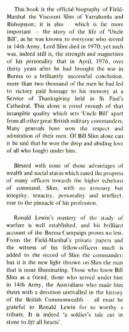 A Biography of Field-Marshal The Viscount Slim, frontispiece and b&w photo illustrations, bibliography & index, xvi & 350 pp, black boards in d/w, spine of d/w faded, some spotting to closed edges of pages, otherwise in very good condition, Leo Cooper 1976