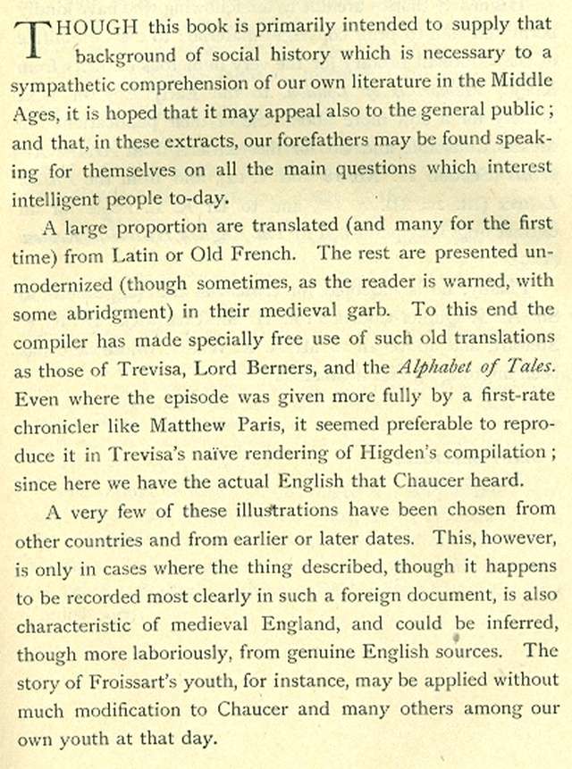 The compiler was a lecturer and later a Fellow of St Catherine’s College at Cambridge University, and specialised in extracting passages and fragments from medieval texts to illustrate life at the time. While the passages in foreign languages have been translated into modern English, the majority of the remaining passages are in the original medieval English. See below an extract from the compiler’s preface.