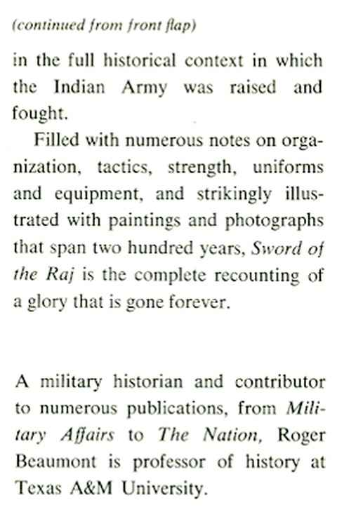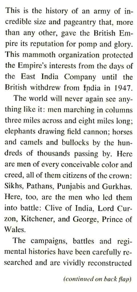 The British Army in India, 1747-1947, b&w illustrations from photographs, paintings and prints, appendix listing Indian campaign medals, bibliography and index, xviii & 237 pp, green boards with yellow cloth spine, in d/w, neat ink stamp of previous owner on front free endpaper, closed edges of pages a little spotted, spine edge of front cover of d/w faded (see picture), otherwise in very good condition, The Bobbs-Merrill Company (Indianapolis, Indiana) 1977