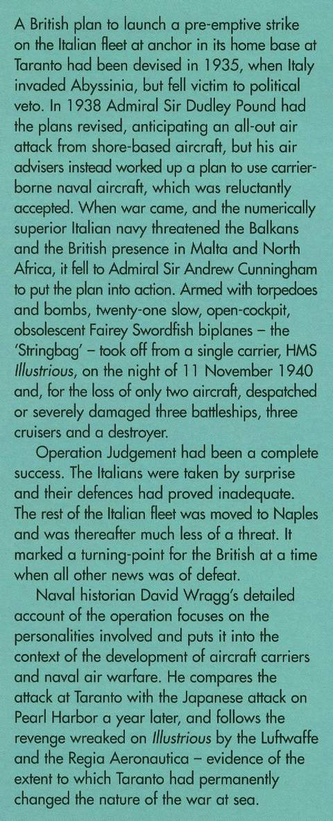 The Story of the Taranto Raid, b&w photo illustrations, location map and maps of the first and second strikes of the raid, plans of HMS ‘Illustrious’, glossary, bibliography & index, xvi & 224 pp, royal blue boards in d/w, top front edge of d/w a little creased, otherwise in very good condition, Weidenfeld & Nicolson 2003