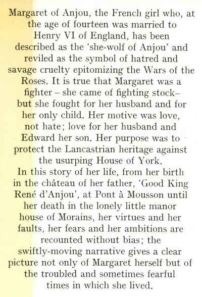 Margaret of Anjou and the Lancastrian Heritage, b&w illustrations from contemporary portraits and drawings, maps, genealogical tables on endpapers, bibliography & index, 224 pp, red boards in d/w, title on spine faded, otherwise in very good condition, Peter Davies 1976