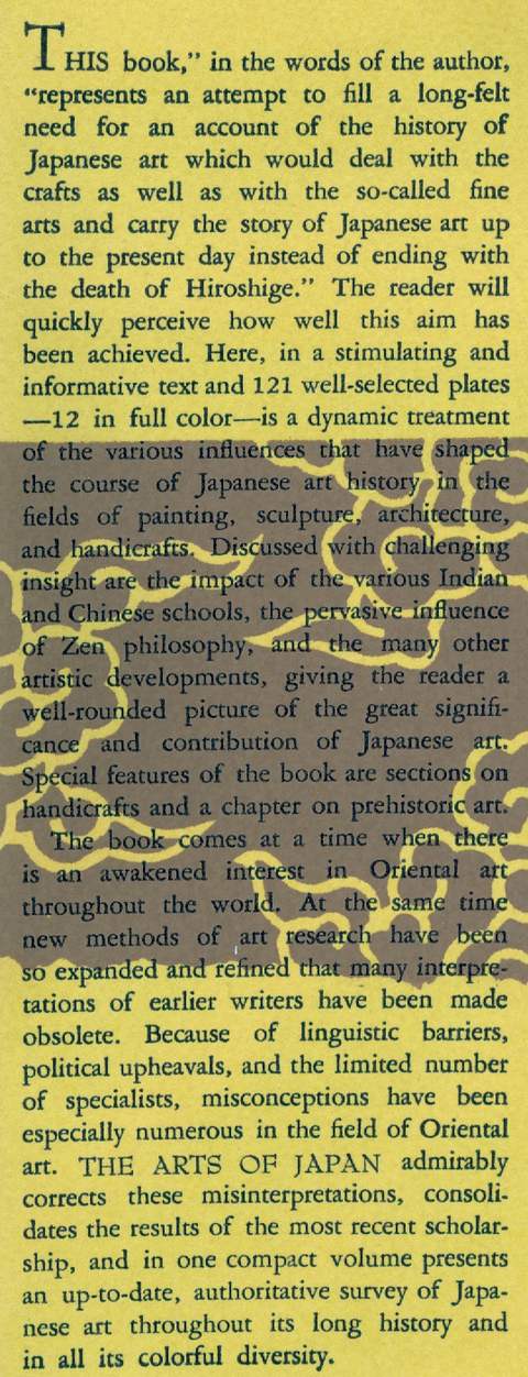 An Illustrated History, colour frontispiece and 11 colour plates, very numerous b&w plates from paintings, drawings, sculptures, architecture and artefacts, bibliography, index, xviii & 201 pp, boards covered in hand-made paper with printed decoration (see picture below), in d/w, small piece chipped from bottom edge of front cover of d/w, spine of d/w faded, otherwise in very good condition, Charles E. Tuttle (Rutland, Vermont) 1957