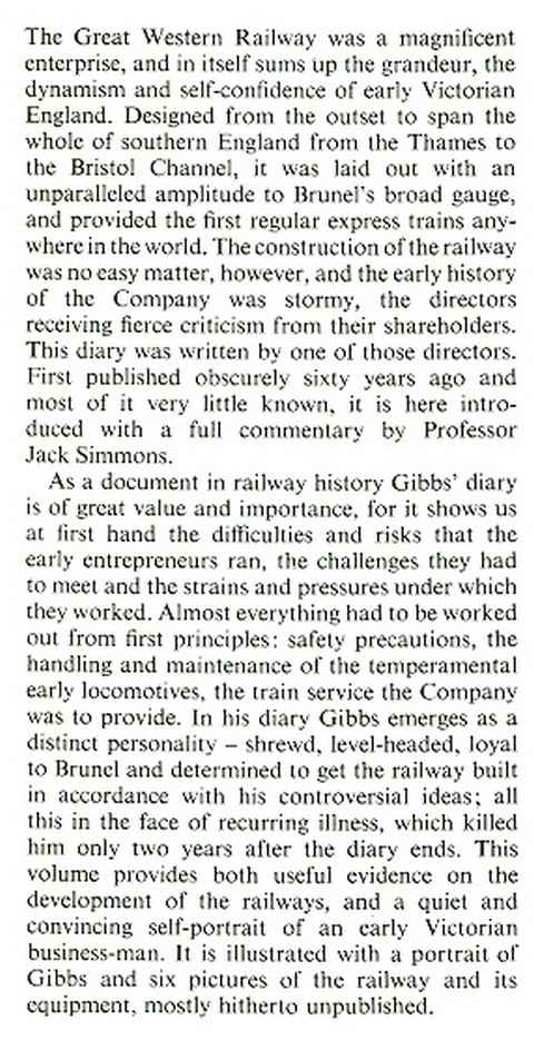 Gibbs was one of the original directors of the railway, and the diary covers the period to 1840. First published in the Great Western Railway Magazine in 1909-10, but deserves a wider audience.