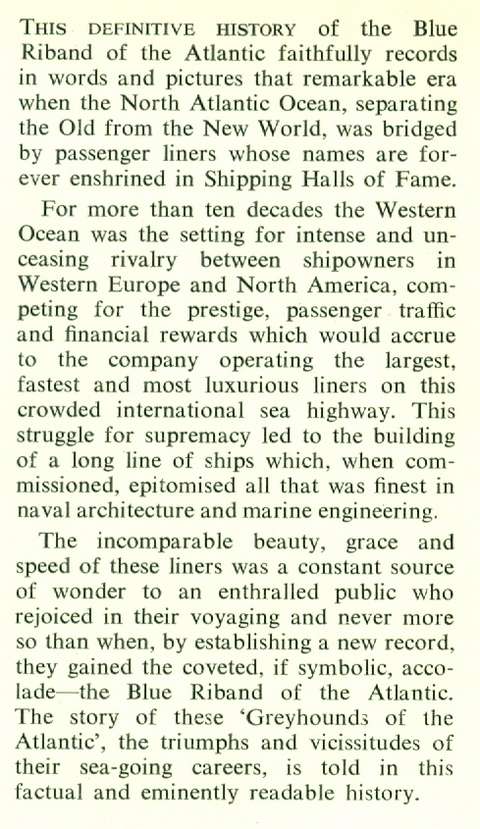 Numerous b&w illustrations from photographs, line-drawings and reproductions of contemporary documents, tables in text, appendices (including record passages 1929-1952, RMS Mauretania speed records, and table of distances), bibliography, index, 192 pp, sewn paperback with flaps, crease across top corner of front flap, edges and corners of covers a little creased and rubbed, spotting to closed edges of pages, otherwise in very good condition, Patrick Stephens (Cambridge) 1976