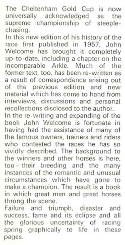 The Story of a Great Steeplechase, 2nd revised edition, illustrations from b&w photographs, appendices listing results and prize money, index, 213 pp, brown boards in d/w, slight dent to bottom of boards, slight browning of pages, otherwise in very good condition, Pelham Books 1973