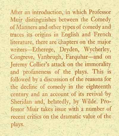A short study of “Restoration comedy and those plays written in the 18th century which were an attempt to capture something of its spirit”.  See also the description (below) from the dustwrapper flap.