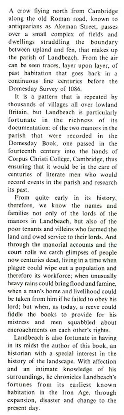 A detailed study of the parish of Landbeach, a settlement on the Roman Akeman Street, five miles north of Cambridge.  It had been owned since the early Middle Ages by Corpus Christi College, so a great deal of information on the parish had been preserved.