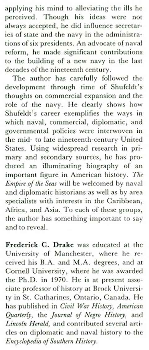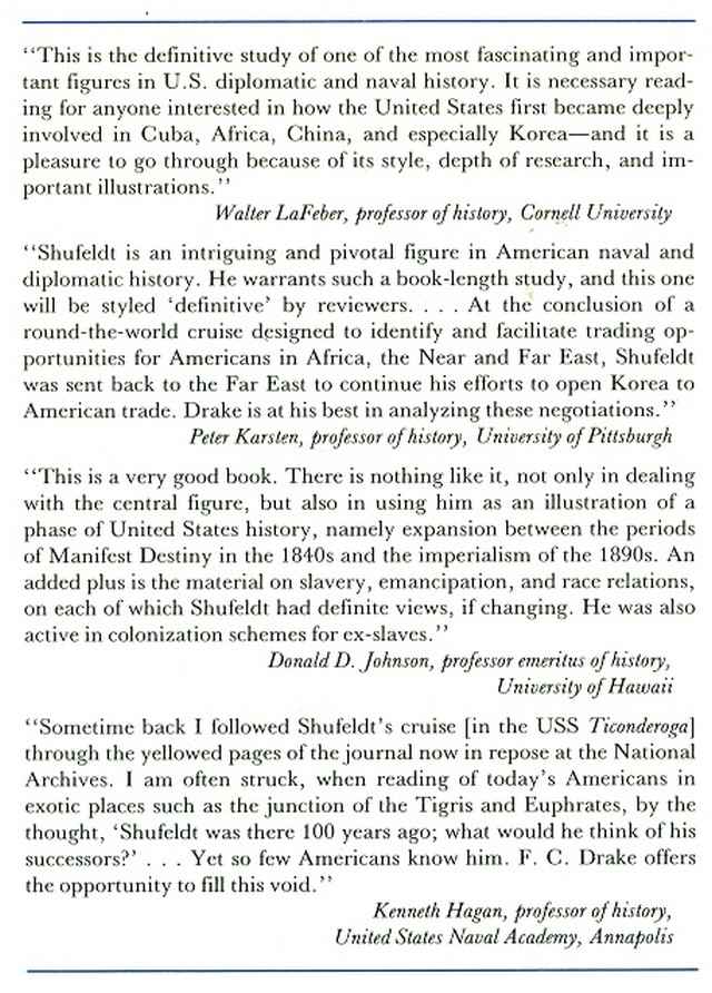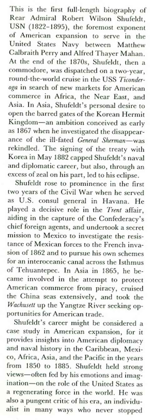 A Biography of Rear Admiral Robert Wilson Shufeldt, U.S.N., portrait frontispiece and b&w illustrations from photographs, portraits and paintings, maps and reproductions of contemporary maps, maps on endpapers, notes, bibliographical essay and index, xvi & 469 pp, blue buckram cloth in d/w, ex-library copy (stamped “Withdrawn”) with stamps on front free endpaper and verso of title-page, damaged strip on rear endpaper where sticky tape removed, d/w a trifle rubbed and patchily faded (see picture), otherwise in very good condition, University of Hawaii Press (Honolulu, Hawaii) 1984
