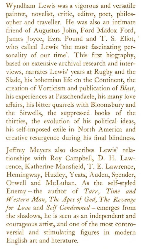 A Biography of Wyndham Lewis, b&w illustrations from photographs, paintings and drawings, chronology, notes, bibliography, index, xiv & 391 pp, green cloth in d/w, very slight denting to spine of d/w (not affecting book underneath), otherwise in very good condition, Routledge & Kegan Paul 1980