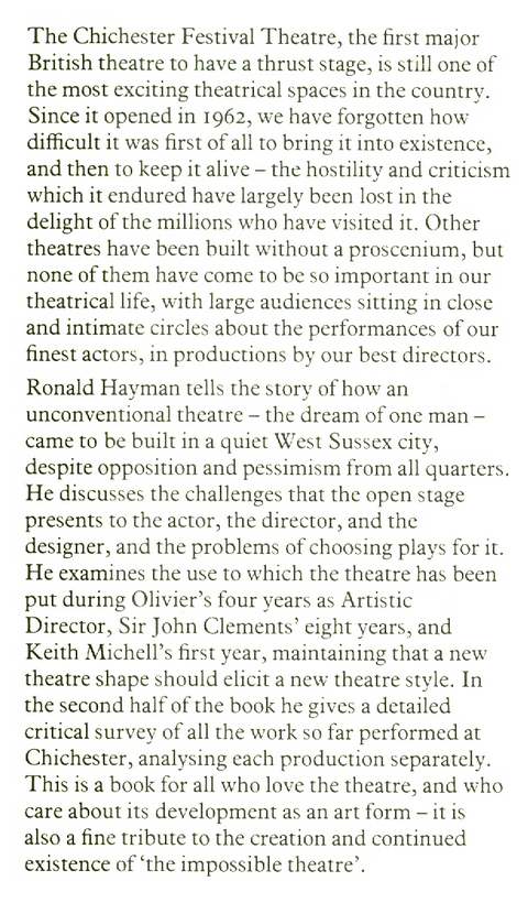 The Chichester Festival Theatre [from its opening to 1974], appendix listing plays and players 1962-74, 215 pp, black boards in d/w, edges and spine of d/w a little darkened, spotting to closed edges of pages, occasionally extending to margins of pages, otherwise in very good condition, Davis-Poynter 1975