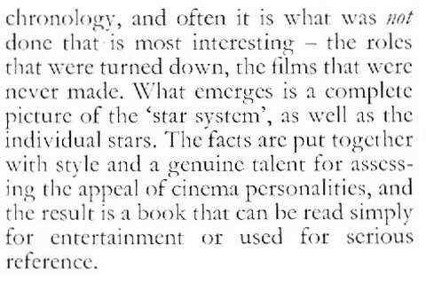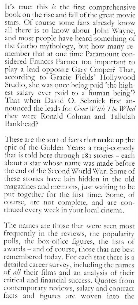 Nowhere in the book is it stated what ‘the golden years’ are.  However, the author carried on his researches and produced two further volumes – ‘The International Years’ and ‘The Independent Years’ – which indicate that this first volume deals with the movie stars who became famous up to and including the Second World War.  So you get Michael Redgrave and Shirley Temple, but not Sean Connery or Elizabeth Taylor. This volume is complete and self-contained.