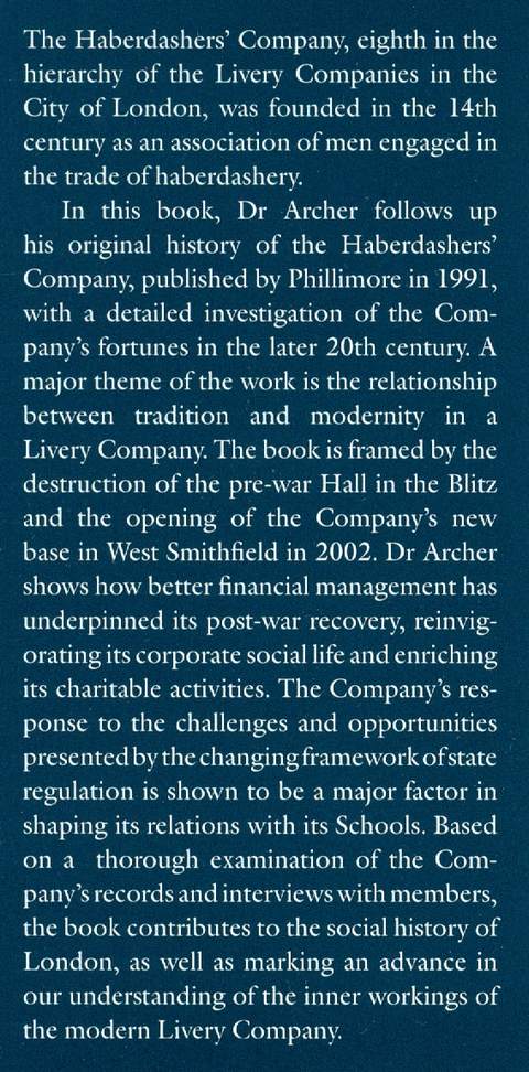 Very numerous photographs (mostly in colour), reproductions of maps, tables in text, floor plans of Haberdashers’ Hall on endpapers, appendices (including table listing Masters and Wardens, 1939-2003, a list of Clerks and Beadles, and a Retail Price Index, 1948-2002), bibliographical notes, index, xiv & 178 pp, dark blue cloth with gilt design on front cover, in d/w, top and bottom edges of d/w very slightly creased, otherwise in near fine condition, Phillimore & Co (Chichester, West Sussex) 2004