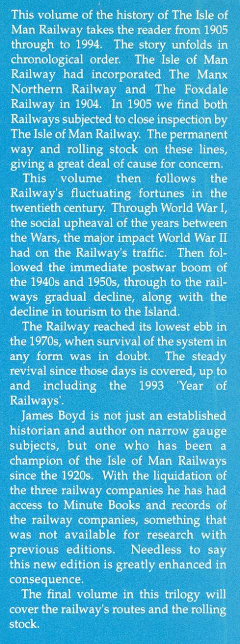 Volume II: An Outline History of The Isle of Man Railway including The Manx Northern Railway and The Foxdale Railway (1905-1994), numerous b&w illustrations from photographs, section drawings, track layout plans and location map, footnotes throughout, bibliography, index, 256 pp, blue boards in d/w, top edge of d/w a trifle creased, top corners of covers very slightly bumped, spine and edges of d/w a little sunned, very slight spotting to top closed edge of pages, otherwise in very good condition, Oakwood Press (Headington, Oxford) 1994