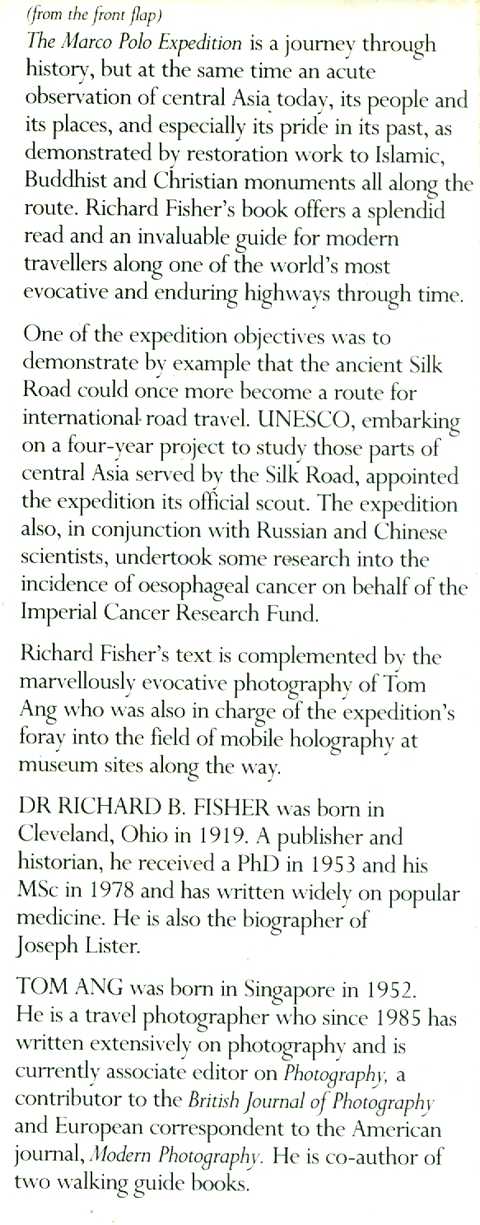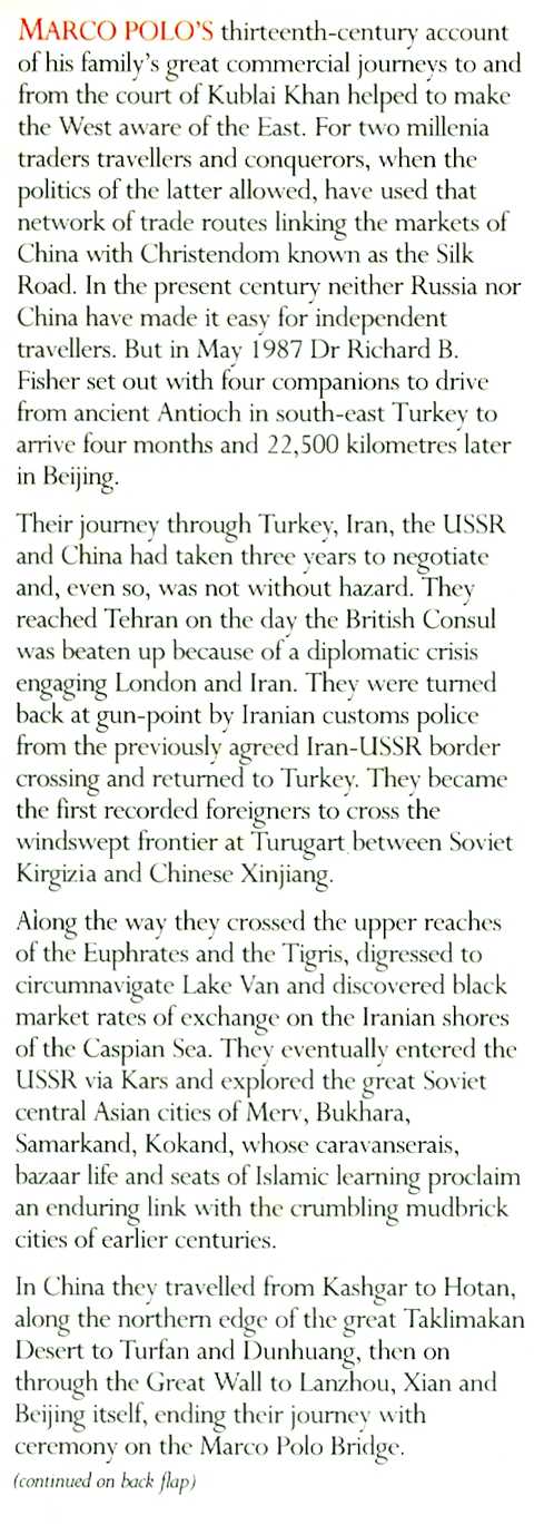See the description (below) from the dustwrapper flaps. The expedition, carried out under the auspices of UNESCO, was to establish whether the Silk Road could still be used for trade purposes. The vehicle used was a Land Rover, and although most of the journey was on roads (the sand tyres they carried were never used), they still managed to break both rear shock absorber mountings on the roads in China. The Toyota Land Cruiser used by their Chinese escorts had no such problems!
