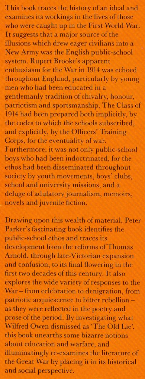 The Great War and the Public-School Ethos, b&w illustrations from drawings, paintings, reproductions of old documents and photographs, notes, bibliography, index, 319 pp, dark green boards in d/w, occasional neat pencil markings in margins, front endpaper slightly marked, boards slightly marked (see note below), spine of d/w a little sunned, otherwise in very good condition, Constable 1987
