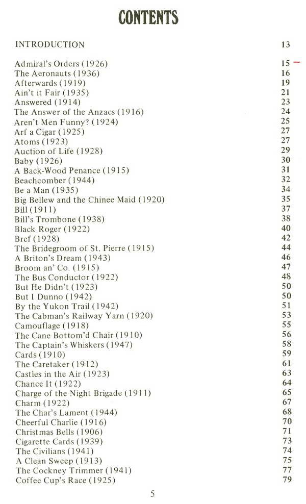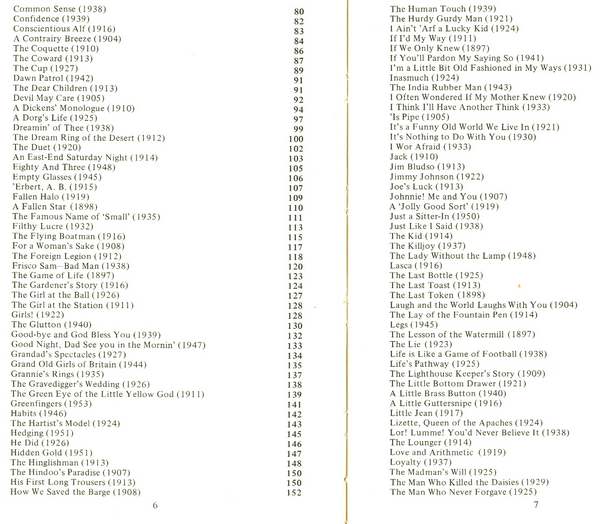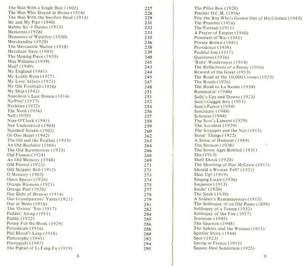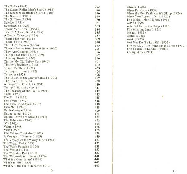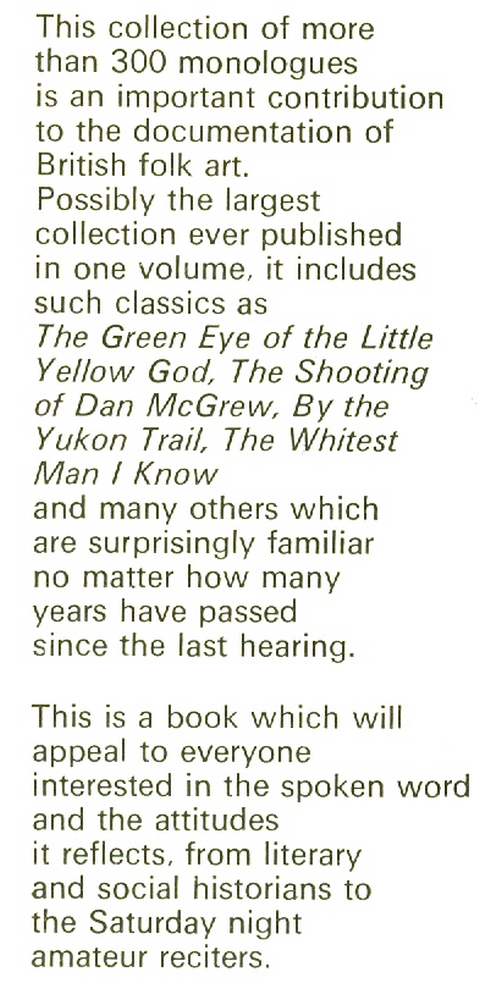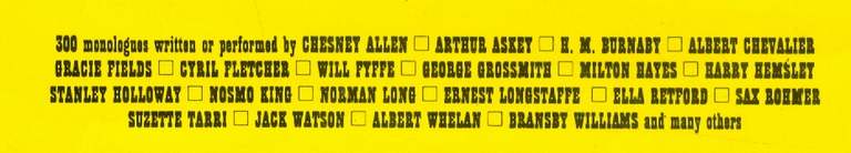 We have reproduced below the strip giving details of the writers or performers of the monologues, but we could think of no way of describing the contents themselves except to reproduce the contents list. Please note this book reproduces only the texts of the monologues. A note on the verso of the title page states that the monologues are published, with music, by Reynolds Music, but our searches of the internet cannot establish whether Reynolds Music still exists, or whether a successor business can still provide the monologues with music.