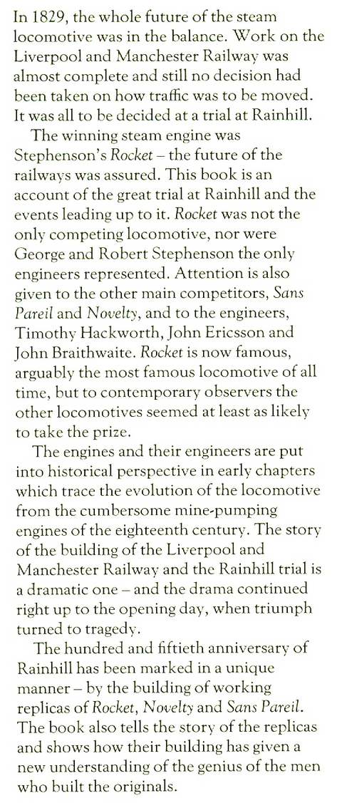 The Great Locomotive Trial, very numerous illustrations (a few in colour) from paintings, engravings, drawings, sketches, cartoons, photographs and reproductions of old documents, route maps, bibliography, index, 164 pp, brown boards in d/w, top edge of d/w very slightly rubbed and top corners a little torn, otherwise in very good condition, British Broadcasting Corporation 1980