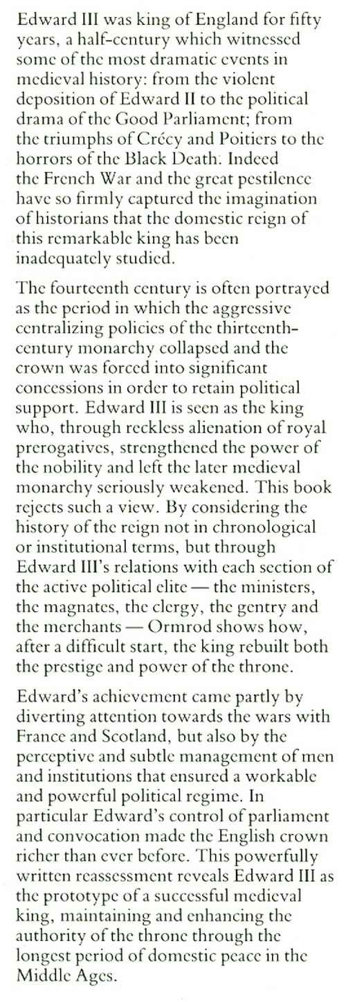 Crown and Political Society in England 1327-1377, b&w illustrations from illuminated manuscripts, sculptures and modern photographs, genealogical tables on endpapers, extensive notes, bibliography & index, xiv & 280 pp, blue boards in d/w, slight staining to bottom of rear board and d/w (not affecting contents at all), otherwise in very good condition, Guild Publishing in association with Yale University Press 1990
