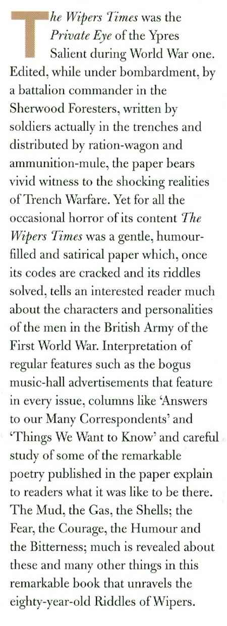 An Appreciation of the ‘Wipers Times’, a Journal of the Trenches, very numerous b&w illustrations from photographs, cartoons and drawings, numerous reproductions of articles from the journal, x & 163 pp, brown boards in d/w, spine and edges of covers of d/w faded (see picture), otherwise in fine condition, Leo Cooper 1997