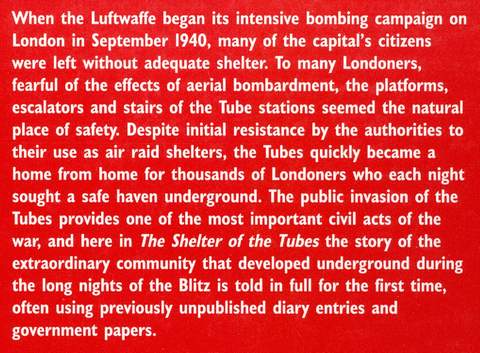 Tube Sheltering in Wartime London, very numerous b&w illustrations from photographs, drawings and cartoons, reproductions of contemporary documents, chronology, notes and bibliography, 96 pp, pictorial glazed boards (no d/w, but we doubt there ever was one), in very good condition, Capital Transport Publishing 2001