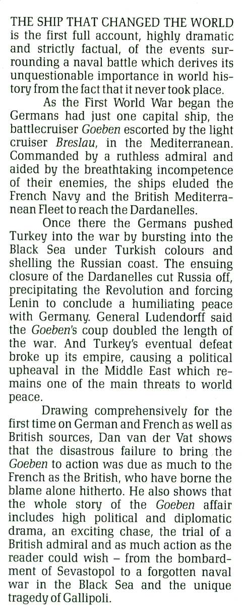 The Escape of the ‘Goeben’ to the Dardanelles in 1914, b&w photo illustrations, maps on endpapers, short critical bibliography and index, 252 pp, blue boards in d/w, very slight foxing to endpapers and to closed edges of pages, otherwise in very good condition, Hodder & Stoughton 1985