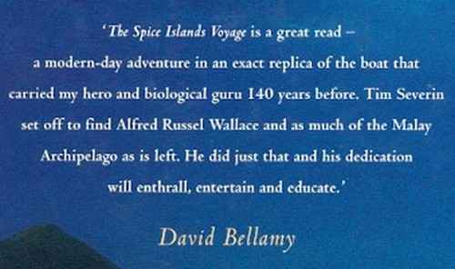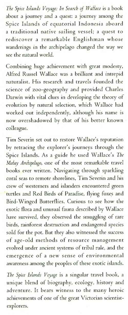 That is, the Indonesian islands between Irian Jaya and Sulawesi, following the journey of Alfred Russel Wallace as described in “The Malay Archipelago” of 1869. See below the description from the dustwrapper flap and the quotation from David Bellamy from the book’s rear cover.