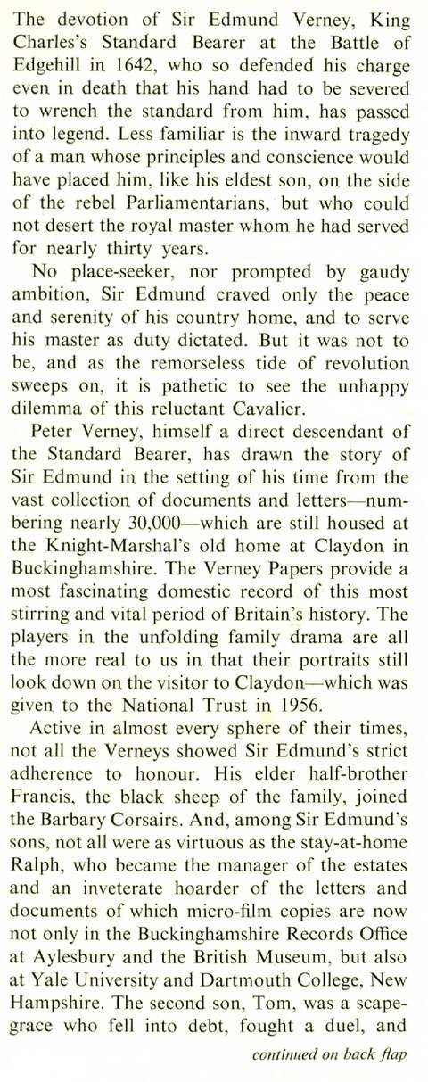 The Story of Sir Edmund Verney, Knight-Marshal to King Charles I, colour portrait frontispiece and b&w illustrations from portraits and photographs, genealogical table, bibliographies, index, 224 pp, black cloth in d/w, top edge of d/w rubbed and torn (but neatly repaired at top of spine), spotting to closed edges of pages, previous owner’s signature on endpaper, otherwise in very good condition, Hutchinson 1963