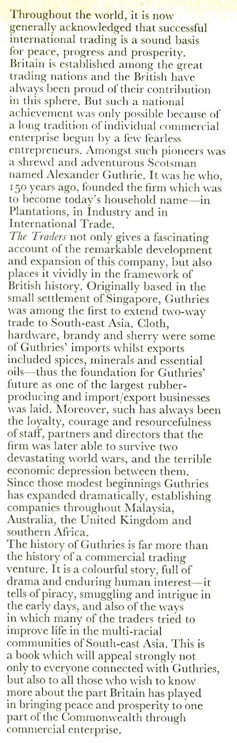 A Story of Britain’s South-East Asian Commercial Adventure, b&w illustrations from photographs, paintings and drawings, appendices (including note on the family of Guthrie), bibliography, index, 352 pp, navy blue cloth in d/w, top and bottom edges of d/w a little creased and rubbed, slight spotting to closed edges of pages, otherwise in very good condition, Newman Neame 1971