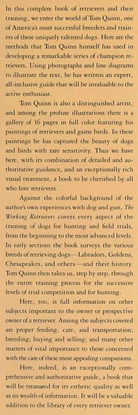 The Training, Care and Handling of Retrievers for Hunting and Field Trials, numerous b&w illustrations from photos, colour illustrations from paintings, diagrams and line-drawings, glossary and index, xii & 259 pp, brown boards with beige cloth spine, in d/w, endpapers a little spotted, tops of boards a little marked, otherwise in very good condition, E.P. Dutton (New York) 1983