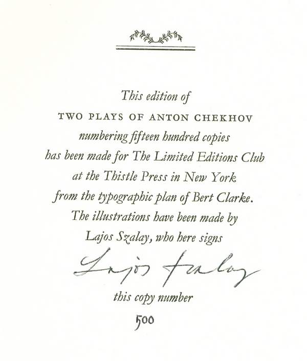 Translated by Constance Garnett – With an introduction by John Gielgud and illustrations by Lajos Szalay, No. 500 of a limited edition of 1,500 copies, Signed by the artist, numerous illustrations (some coloured, see specimen below) from Szalay’s line-drawings, xvi & 155 pp, top edge red, others uncut, patterned cloth with black leather spine, in slip-case, edges of slip-case a trifle rubbed and faded at edges, otherwise in near fine condition, Limited Editions Club (New York) 1966