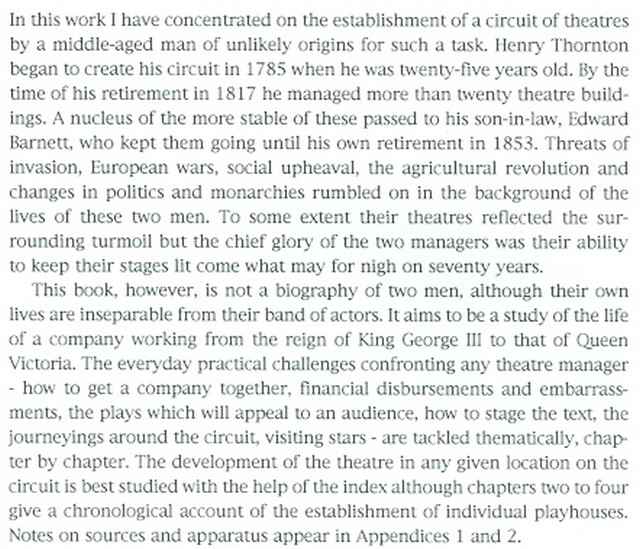 The Everyday Life of the Thornton-Barnett Theatre Company 1785-1853, b&w illustrations from portraits, prints, drawings and old photographs, reproductions of playbills and old documents, maps (including one on endpapers), bibliographical appendix, index, xiv & 245 pp, glazed pictorial boards (no d/w, but I doubt whether there ever was one), top and base of spine a trifle bumped, slight crinkling to some pages (as if from damp, though there are no damp marks), otherwise in very good condition, Society for Theatre Research 2001