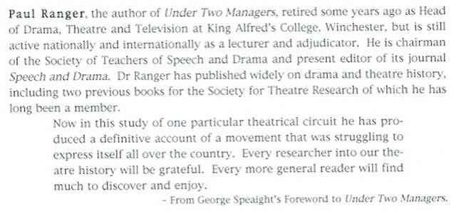 Operating largely in the south of England – the two theatres furthest north were Oxford and Chelmsford. See below the extract from the author’s introduction, and the biographical note from the book’s rear cover.