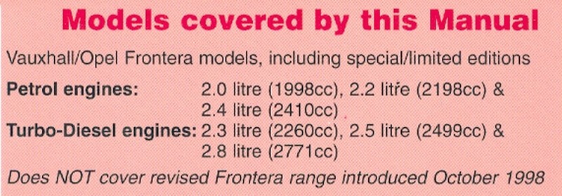 Haynes are to be congratulated for keeping so many of these manuals in print, but most of the manuals still in print are only available in a paperback edition, which is rather less durable than the wipe-clean cover of the original hardback edition. This particular manual for the Vauxhall/Opel Frontera is still in print in hardback at £17.24.