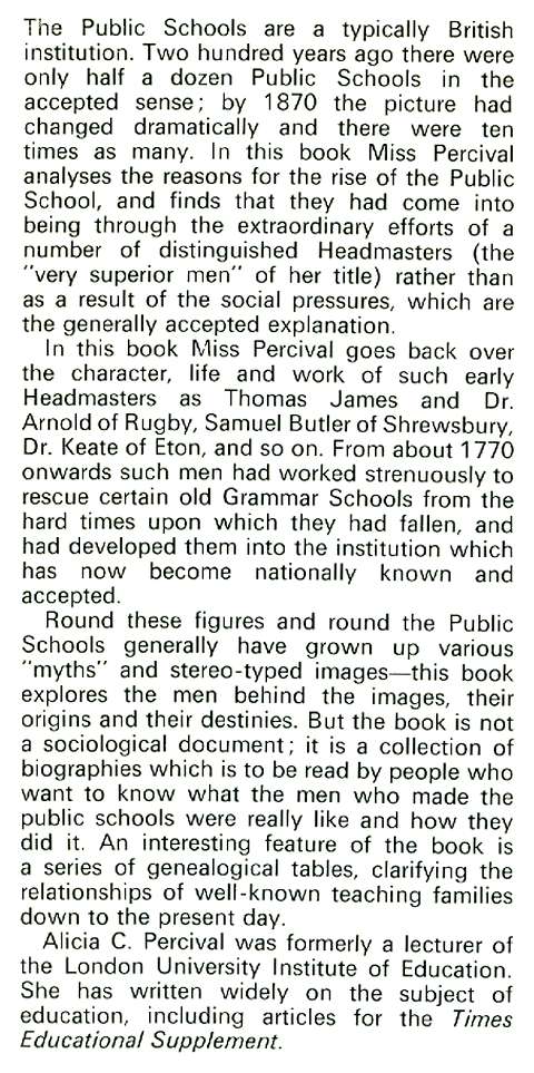 Some Early Public School Headmasters and Their Achievements, b&w illustrations from portraits, engravings and photographs, location map, bibliography and index, viii & 285 pp, green boards in d/w, spine and back edge of d/w sunned and slightly rubbed, closed top edge of pages spotted, otherwise in very good condition, Charles Knight & Co. 1973