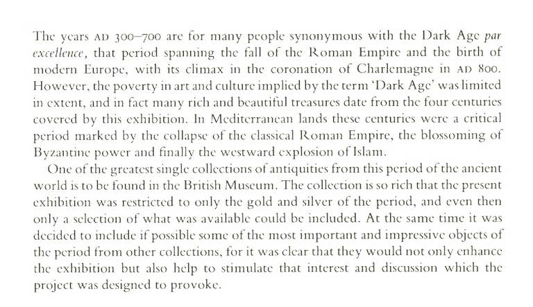 Gold and Silver AD 300-700, catalogue of British Museum exhibition with very numerous photographic illustrations (some in colour) of artefacts, six maps, bibliography and abbreviations, 192 pp, sewn paperback, edges of covers a little darkened, corners a little bent, otherwise in very good condition, British Museum Publications 1977